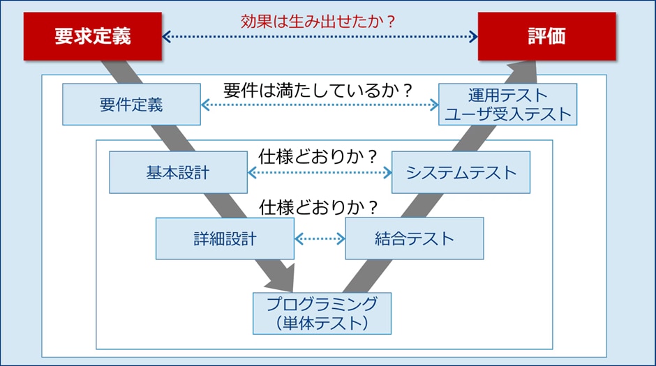 上流工程の成果物である要件定義書や設計書は、最終的にテストによって正しさが検証されます。そのため、初期段階からテストの観点を意識する「V字モデル」での進行が重要です。