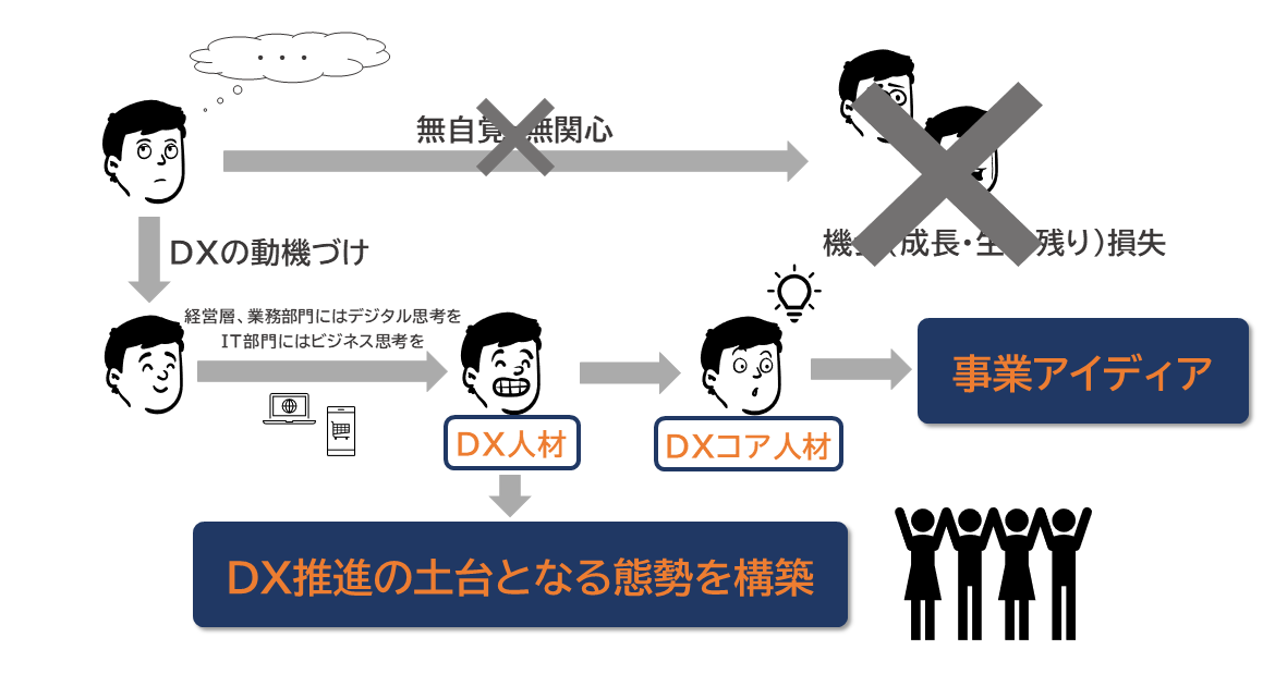 DXリテラシー強化の狙いは、DX推進の土台となる態勢を構築することです。デジタル思考やビジネス思考を持ったDX人材を育成し、その中から将来的にDXコア人材となる人材を確保することで、DXを推進していくことができます。