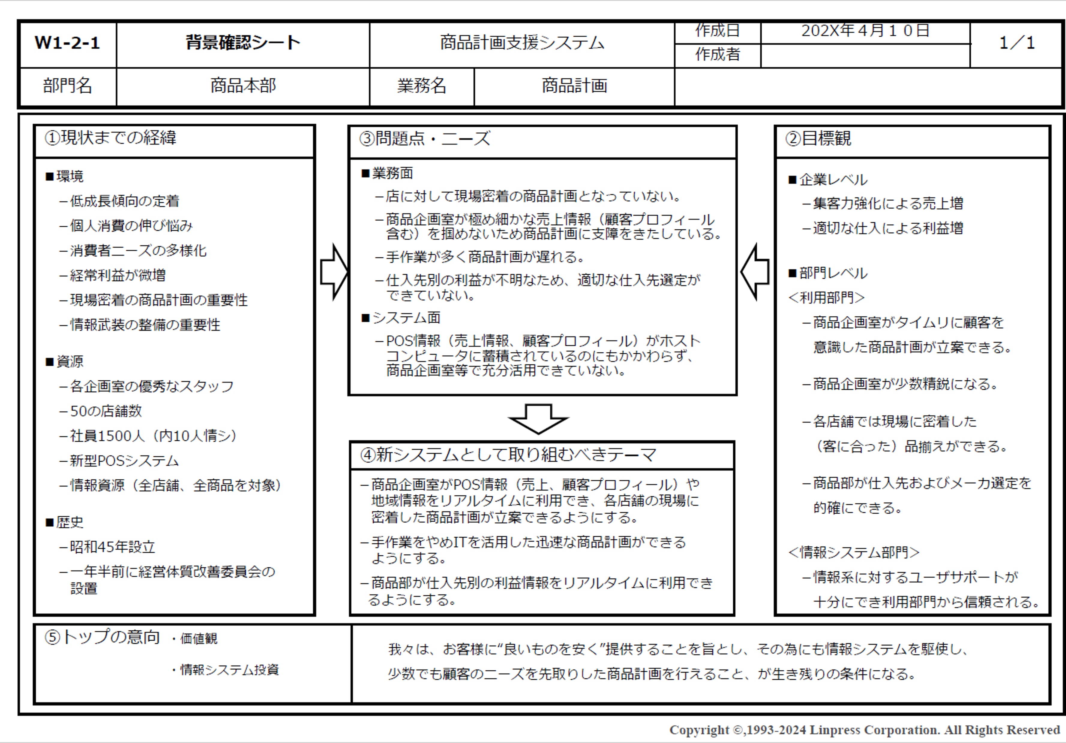 大下様:今回の研修を通じて、我々のなかでIT企画における"共通的な考え方"を持つことができたのは非常に有意義であったと思います。特に、プロジェクト発足時にしっかりと新システムを構想するに至った"背景"をおさえることが最も重要である、という学びがありました。参加者からも各ステップで作成する成果物のなかで、特に「背景確認シート」(※)が参考になったという声が多かったです。