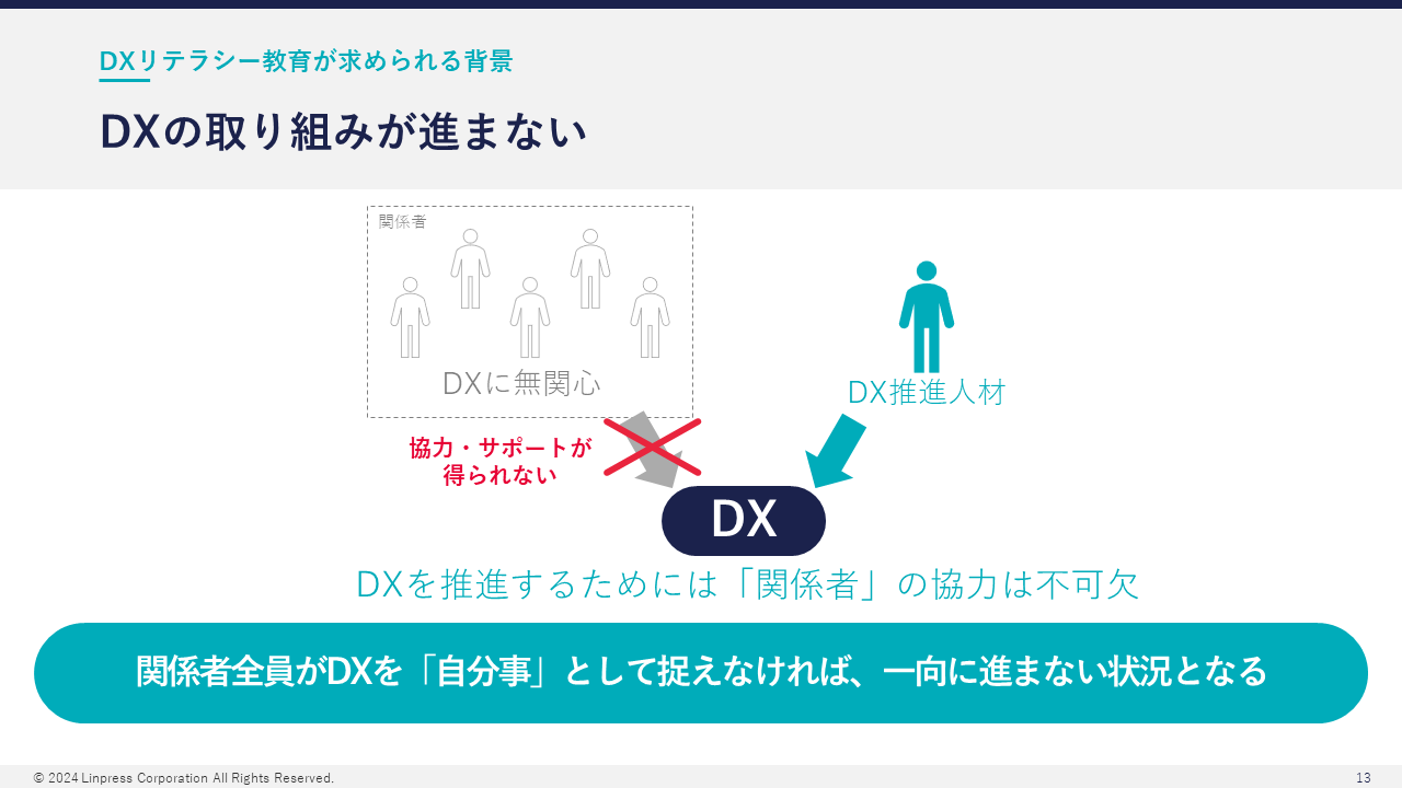 これらの課題を解決するためには、経営層を含む全社員が"DXの重要性"や"活用されるデータや技術"(=DXリテラシー)に関する理解を深め、