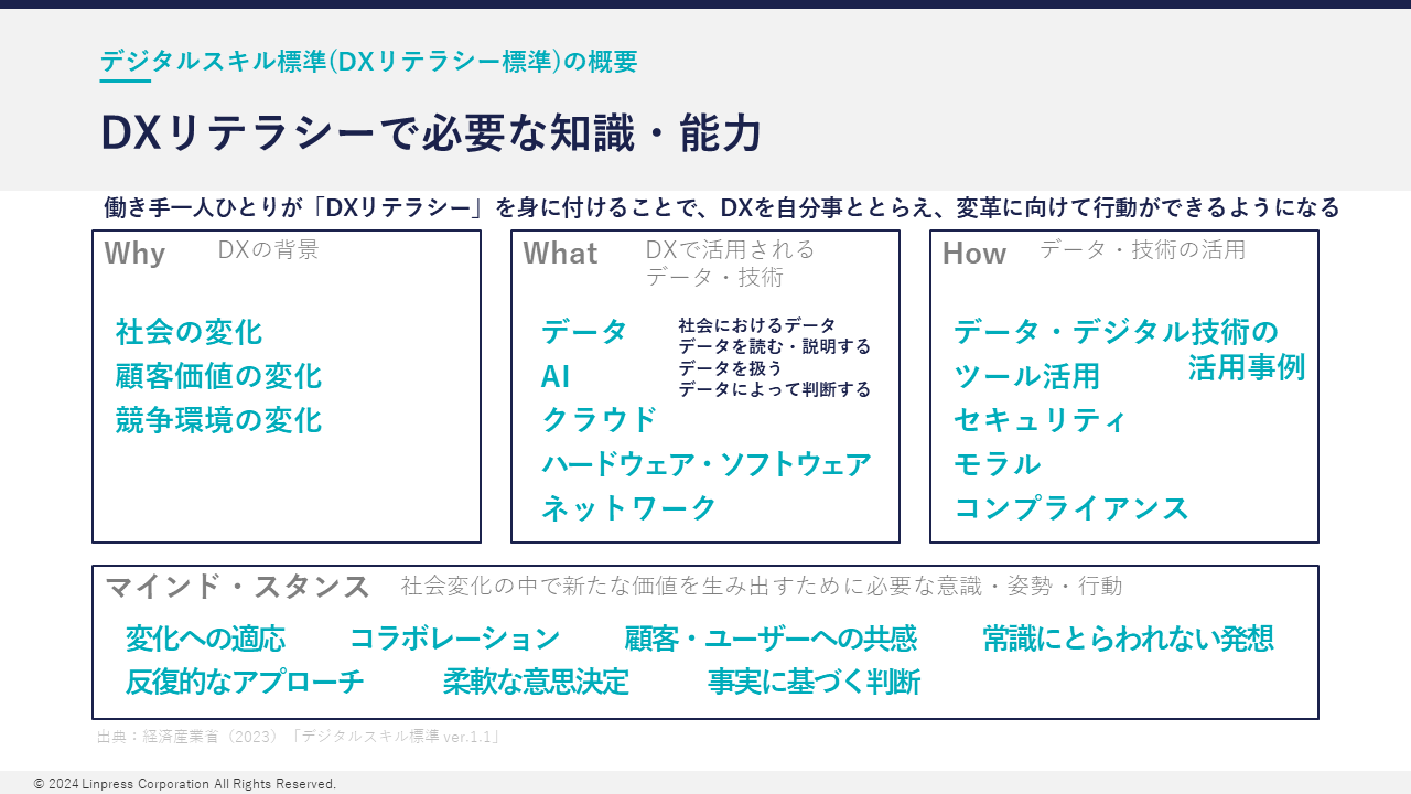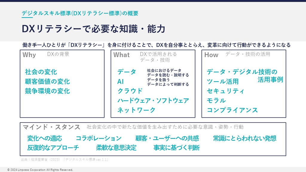 DXリテラシーの概要と必要性について分かりやすくまとめられていたので参考になった。