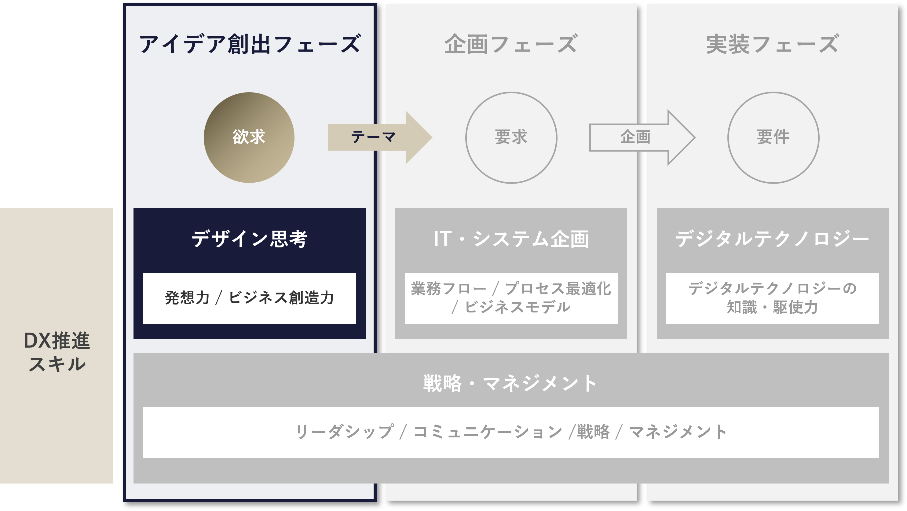 顧客起点の価値創出が求められるようになったいま、DX推進人材にはテクノロジーや専門的な知識よりもむしろ「本質的な課題を導出・設定する力」「自ら問いを立てる力」が重要であり、そのためのアプローチとして「デザイン思考」が注目されています。